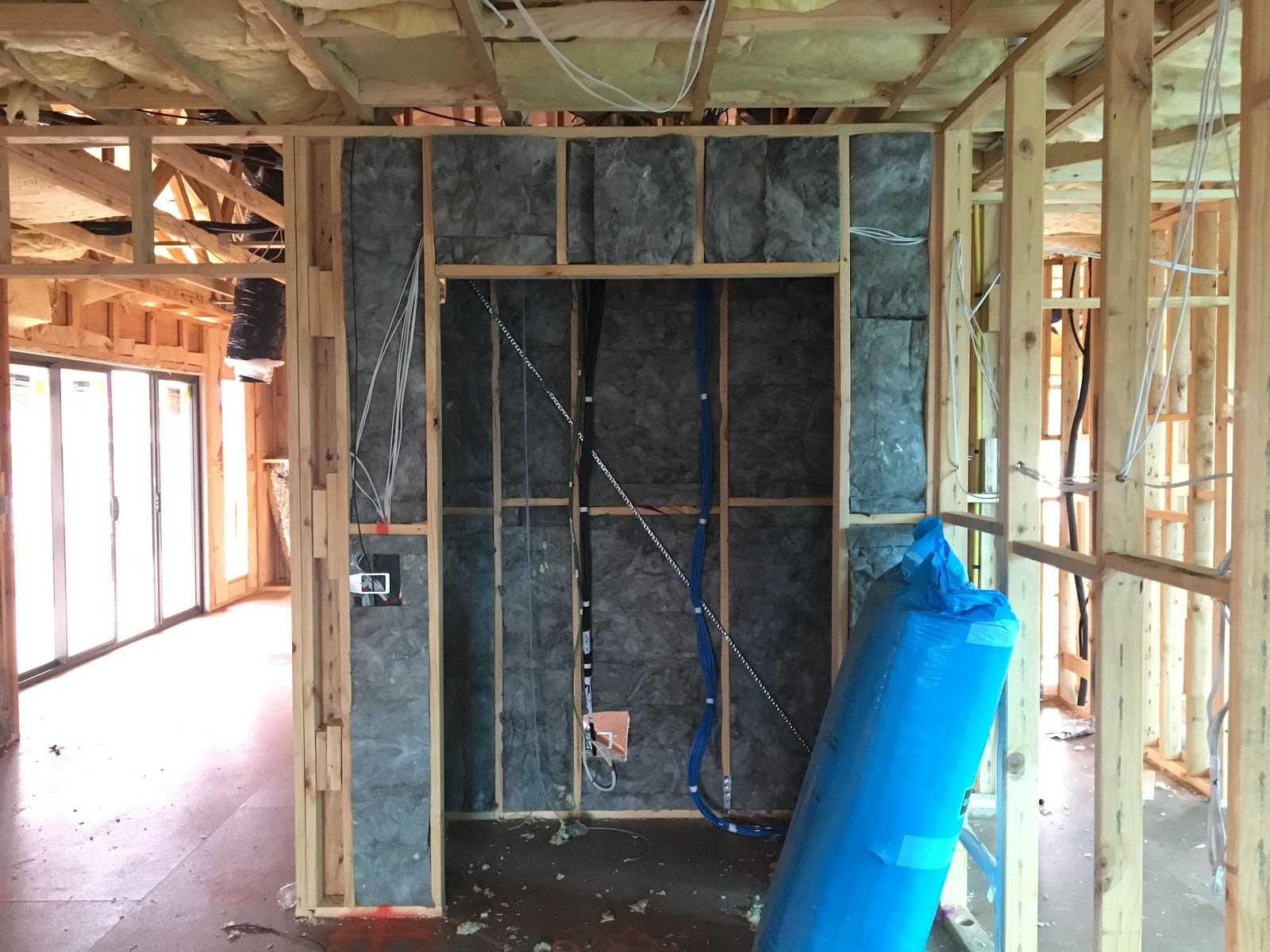 I was happy to see that our house was getting full insulation to the walls and the ceiling and all of our external doors are sealed to stop draughts. The insulation crew were there for about a day and a half to install all of the insulation in the walls and ceiling. While they were there doing the installation I arrived to have a look around. After a brief discussion I had arranged a bit of extra sound insulation to be installed as direct work with me. As mentioned earlier we added sound insulation in out theatre area but I hadn't considered sound transfer for our rumpus room area into the bedrooms. The insulation guys were really good and installed Bradfords Soundscreen R2.5 Batts in the walls between bedrooms and rumpus/stair landing space. It didn't cost a great deal of money but should help with noise transmission between rooms.